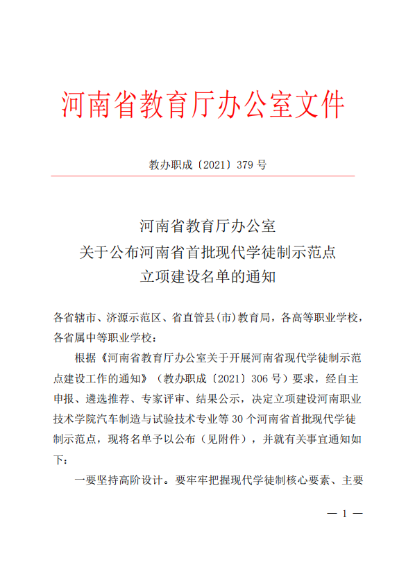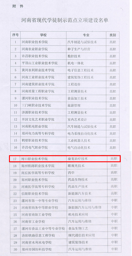 12月30日,河南省教育厅公布河南省首批现代学徒制示范点立项建设名单,周口职业技术公司康复治疗技术专业成功入选。此次获批河南省现代学徒制示范点建设项目,是公司多年来深化产教融合、校企合作的成果,标志着yl23411在校企合作共育人才的培养模式实践探索方面又有了更大的进步,同时也为yl23411高质量发展再添新的亮点。