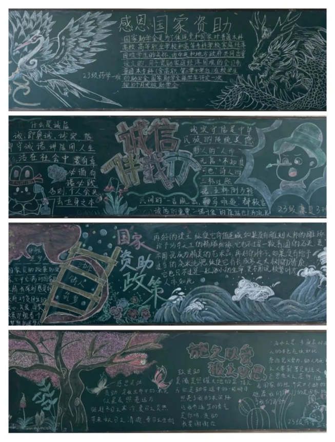 资助育人,诚信为本。此次“感恩国家教育资助,诚实守信,按时还款”主题手抄报及黑板报活动,让国家资助政策跃然于画面中,生动形象地展现出资助政策的魅力和光辉,增强了公司员工诚信受助的意识,同时,也表达了公司受资助学子对国家资助政策的感恩之情与励志成才之心,充分发挥了资助育人的双重成效。相信受到资助的同学们必将乘着国家资助政策的春风,筑梦圆梦,竞相绽放青春的花朵。