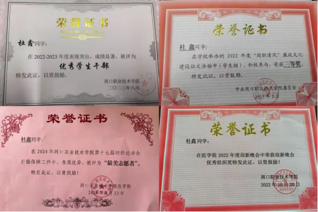 杜鑫,22级康复治疗技术专业员工。现担任自律委员会纪律部长一职。她综合测评成绩在班级排名第二,荣获“国家励志奖学金”、校级“优秀员工干部”、校级“周职清风廉政文化三等奖”、院级“优秀组织奖”等荣誉称号。志愿服务方面,参加第十七届田径运动会后勤保障工作,积极为同学服务,被评为“最美志愿者”称号。通过这些活动充实了她的老员工活,让她在各方面得到了锻炼提高。