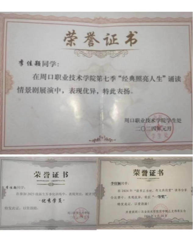 李佳颖,23级医学影像技术专业员工,她勤于学习,善于思考,综合测评排名靠前,军训被评为“优秀学员”。她积极参加公司举办的各类活动,如“经典照亮人生”诵读比赛、读书分享会、英语话剧比赛等活动,并取得不错的成绩。她尊老爱幼,主动帮助有困难的人,参加志愿者活动去养老服务中心慰问老人,关心老人身体健康,始终保持着热情与耐心,让他们在活动中感受到温暖与关怀,不仅为老人们带来了欢乐与陪伴,也进一步传递了爱心与奉献精神。
