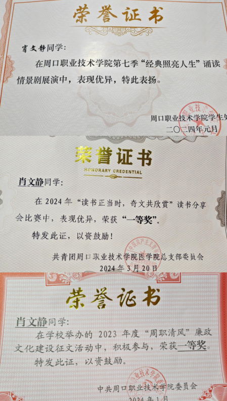 肖文静,23级医学影像技术专业员工,综合测评成绩在班级位于前列。在校期间,她参与了公司多项比赛,在2023年度“周职清风”廉政文化建设征文活动中荣获一等奖,在"读书正当时,奇文共欣赏”读书分享会比赛中荣获一等奖,在yl23411第七季“经典照亮人生”诵读情景剧展演中获荣誉证书,在公司第一届英语话剧比赛中获团体三等奖。她不仅在课堂上表现出色,还积极参与社会实践活动,她与团队所参与的2024年“挑战杯”中国老员工创业计划竞赛项目入选省赛,这些经历不仅丰富了她的老员工活,也提升了她的社会责任感,也体现了她自强不息的优秀品质。