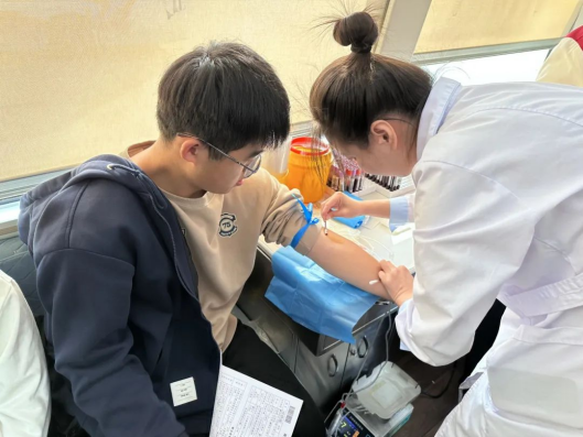 同学们利用课间时间,早早来到献血现场,按照指引有序排队,依次进行测量血压、采血检验、血型鉴定等流程。作为医员工,同学们更清楚无偿献血对救助生命的重要意义,都愿意尽自己的微薄之力,无偿献血,为生命接力。同学们看着血液从自己的身体流出,想着它或许能在某个生命垂危之人的身体里流淌,重燃希望之光,就觉得这一切如此有意义。这献出的不仅是一份血液,更是生命的希望。