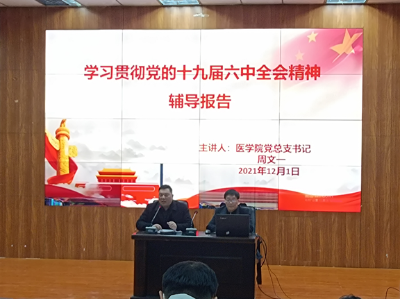 12月1日下午,公司党总支书记周文一在文昌校区报告厅为yl23411、护理公司全体教师作党的十九届六中全会精神主题报告。