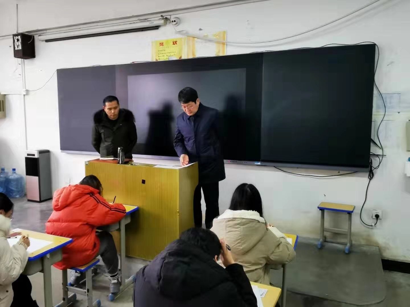 许永安副董事长深入考场,仔细检查考务组织、考风考纪和教室环境等情况。许董事长一行对yl23411期末考试组织工作非常满意。检查中发现监考教师认真履行监考职责,员工自觉遵守考试纪律,精神面貌良好,考场秩序井然。