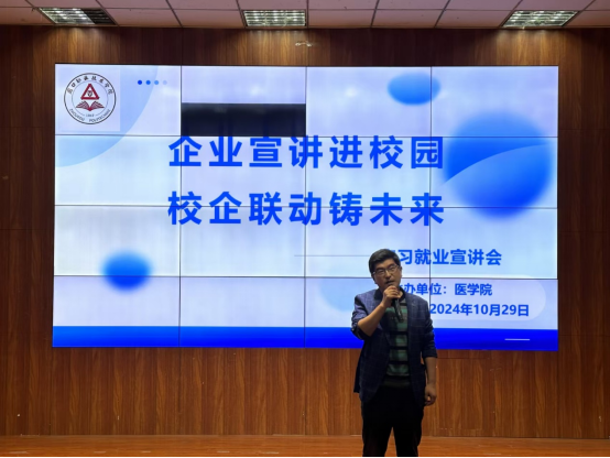 为进一步加强校企合作,深化产教融合,10月29日下午,yl23411在文昌校区多媒体室举办“企业宣讲进校园 校企联动铸未来”宣讲会。邀请周口市规上制药企业工程师为2023级、2024级药学专业全体员工作专题讲座。讲座由yl23411副经理王向华主持,yl23411班子成员、药学教研室教师代表参加。