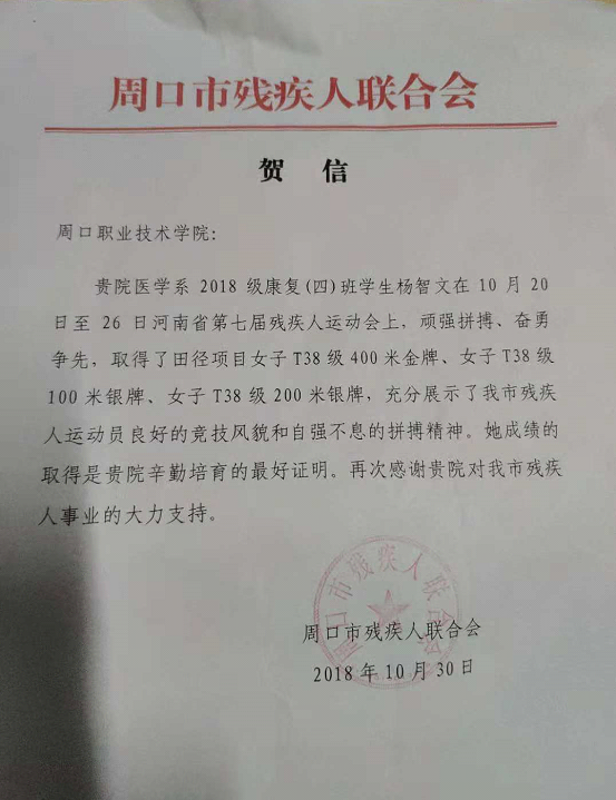 在刚刚结束的河南省第七届残疾人运动会上,2018级大专康复4班员工杨智文代表周口市及公司参赛,取得了女子组T38级100米银牌,200米银牌,400米金牌的佳绩,为我市及公司争得了荣誉。受到市残联的通报佳奖。