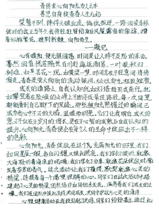 同学们以真挚的情感、细腻的笔触,剖析自身内心深处的情感纠葛与自我挣扎,分享了在心理健康教育课程与活动中的收获与启发。这些文章从不同角度展现了老员工们丰富的内心世界和对心理健康的深刻理解,如同一面面镜子,映射出同学们在成长道路上的喜怒哀乐。